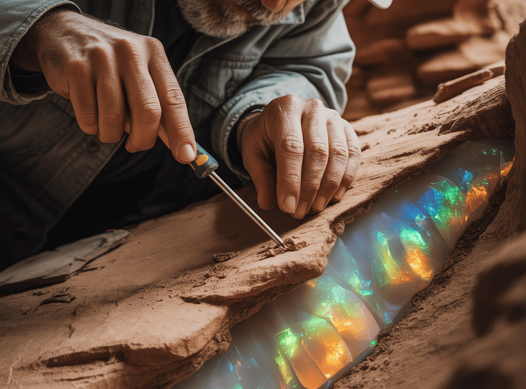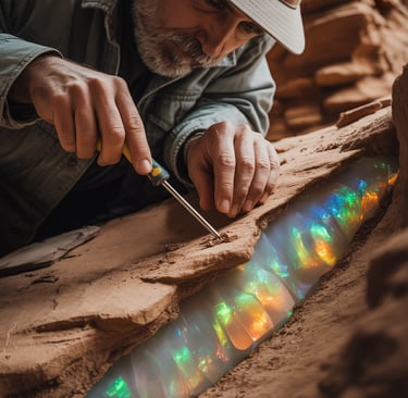 Als er das gesamte Stück freigelegt hatte, leuchtete er direkt darauf. Die Lampe schien die Opale zum Leben zu erwecken: Sie tanzten, sie flüsterten, sie schrien in Farben. Es war kein einzelner Edelstein, es war ein ganzes Schatzkästchen, ein "Nähkästchen" voller perfekt geformter, leuchtender Steine. Einer war so groß wie sein Daumen, ein anderer ein langer, funkelnder Streifen.